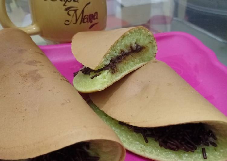 - Takar 250 ml adonan lalu masukkan kedalam teflon.masak dengan api kecil sekali sehingga terbentuk bulat2.lalu tutup teflonnya.tambahkan susu kentak manis,lalu taburi meisis (sesuai selera).kemudian lipat.potong menjadi beberapa bagian.sajikan selagi hangat.anak anak pasti suka.