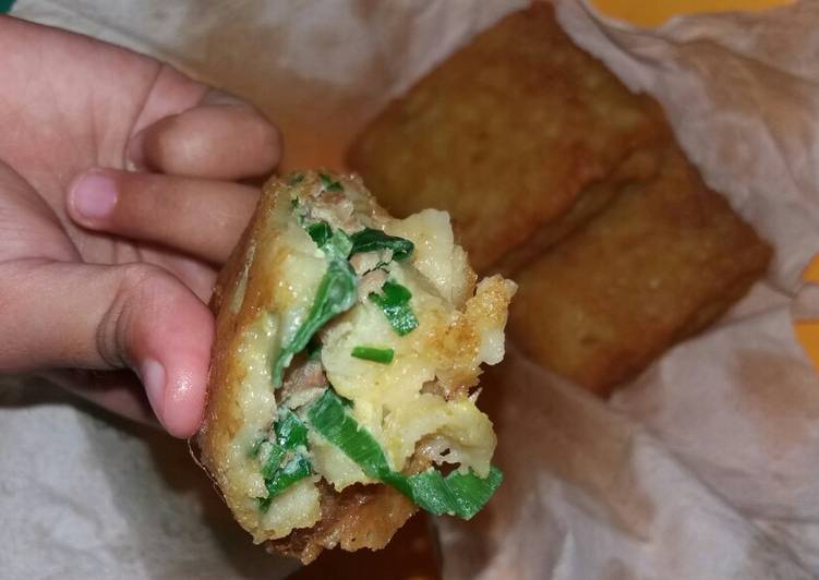 - Ambil 1 kulit, masukkan isian lalu lipat masing sisi yg bersebrangan. Langsung digoreng biar telur dr isiannya tidak ambyar.