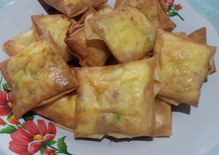 - Siapkan 1 lembar kulit lumpia,lalu beri isian dg 1 sdm,lipat seperti amplop dan olesi dg bahan perekat,lakukan sampai habis.
